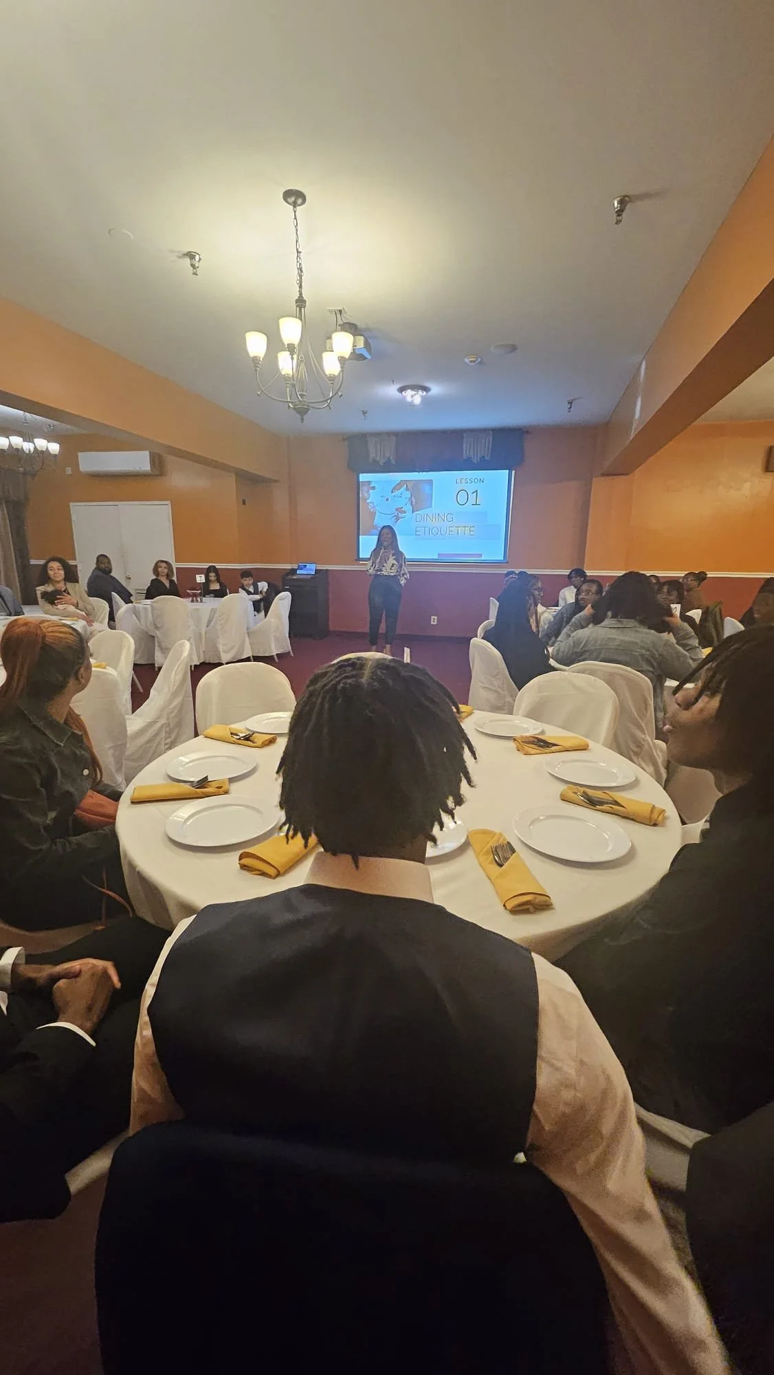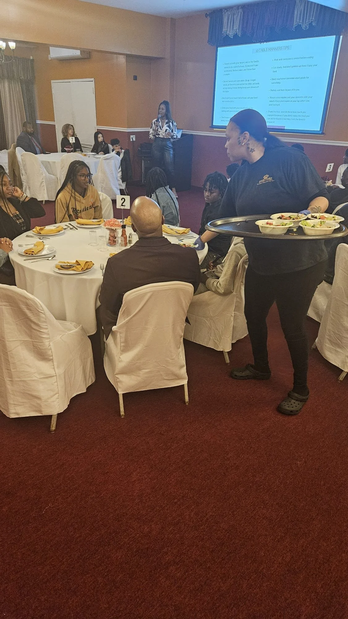 Alisha Pean, Program Director, led the etiquette lesson during a buffet style dinner. Students from Newark Public Schools (HS) learned the foundations of dining etiquette and table manners at King’s Restaurant in Newark, NJ.